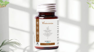 Vrishvrindaa Moringa Capsules, a natural supplement with plant-based nutrition to support overall well-being, promote cardiovascular health, and boost energy and stamina.